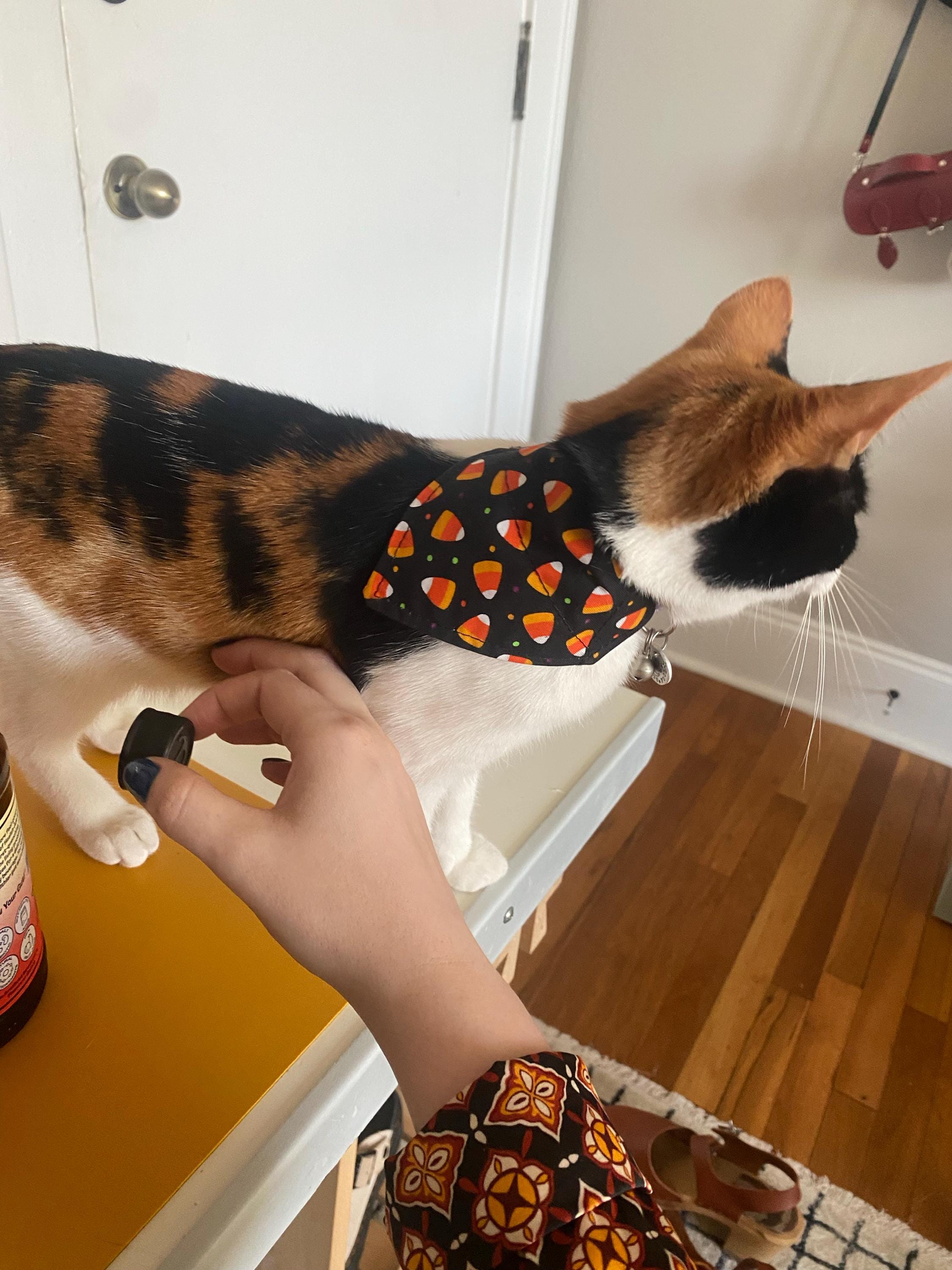 FUN Candy Corn Dog/Pet Bandana with Matching Face Mask and Hair Scrunchie. Check out of FUN matching Bandana Sets to match your pet. Quality Handmade Pet Bandanas, Hair Scrunchie, Headbands, Face Masks.