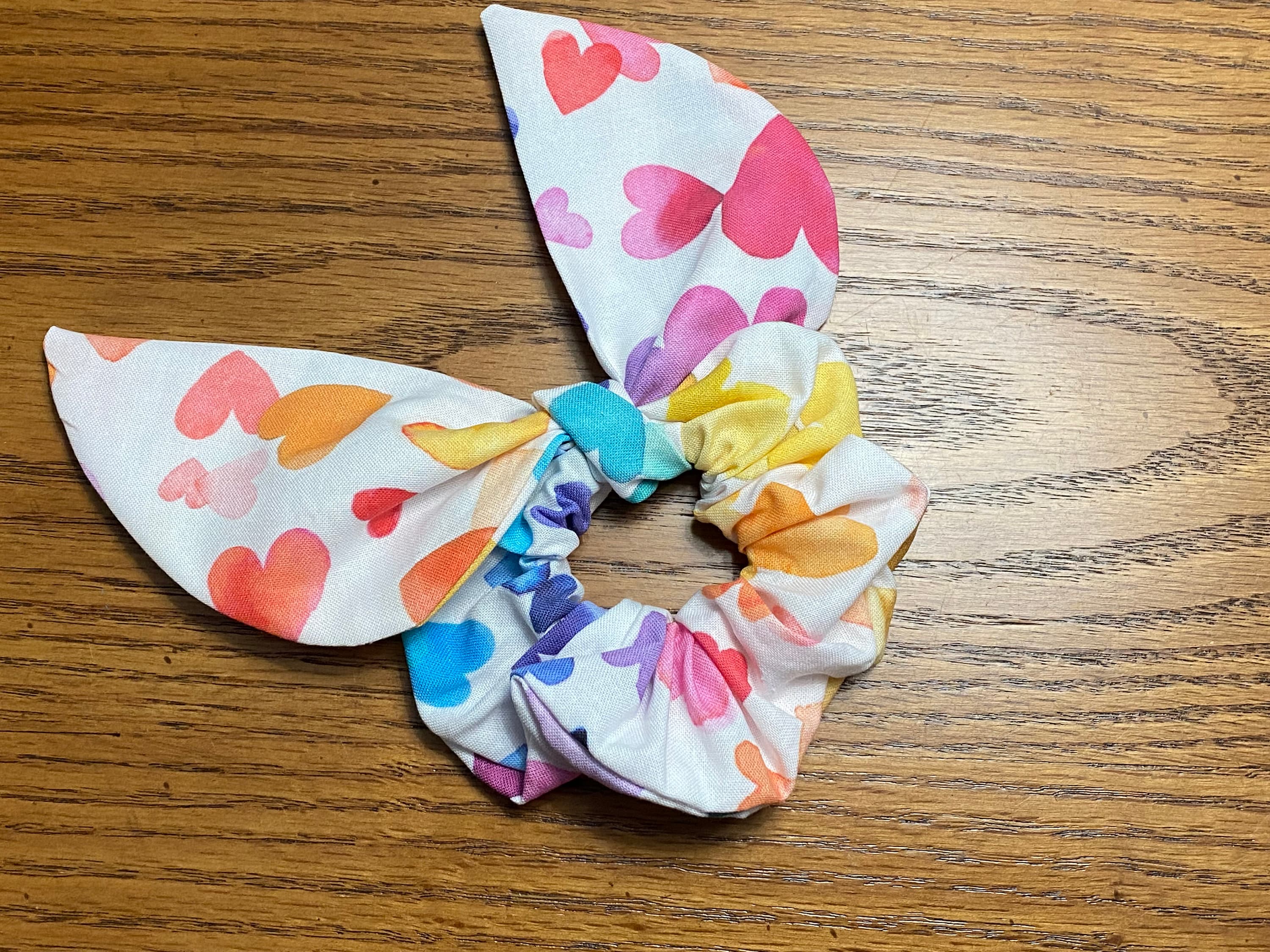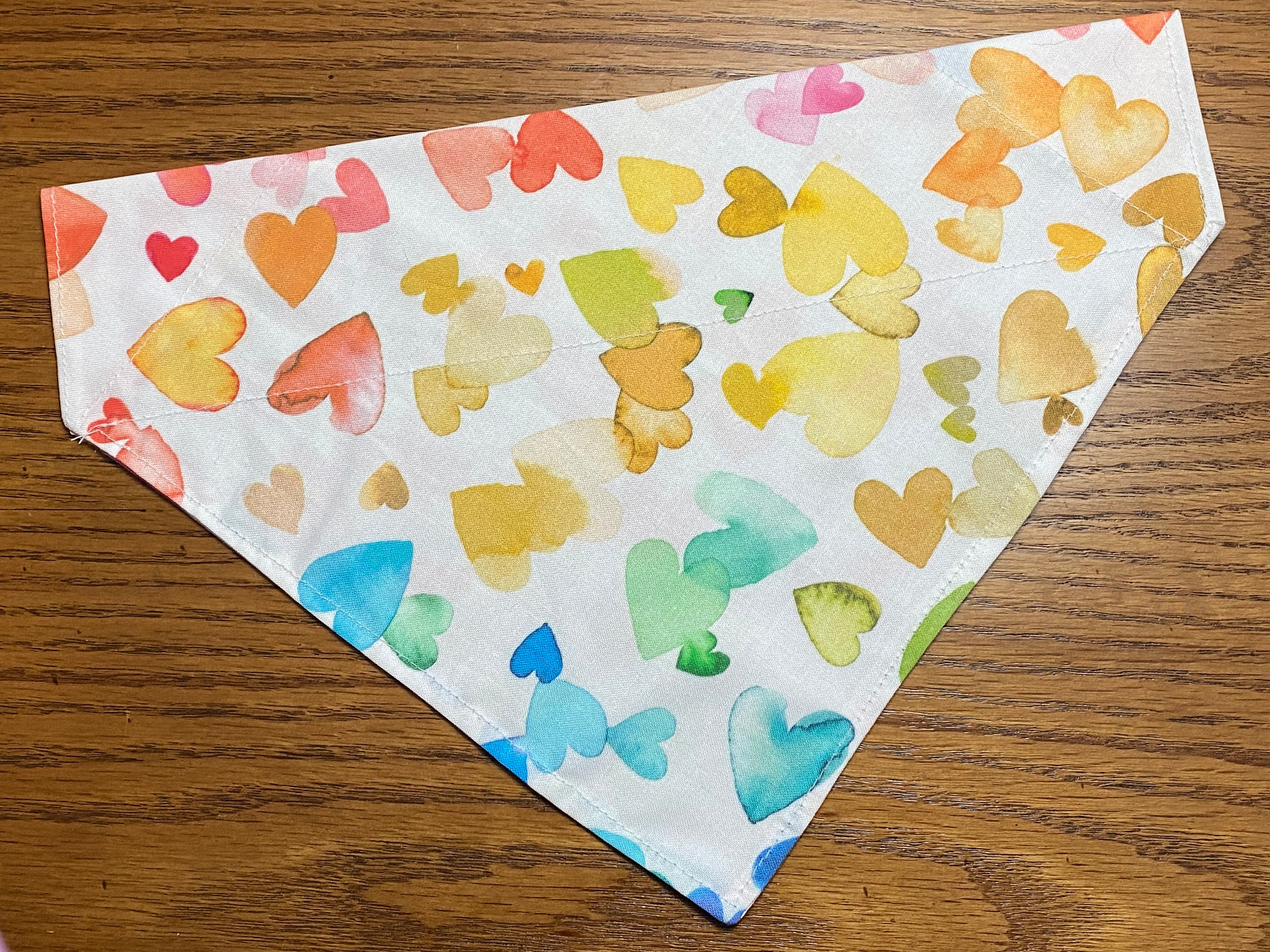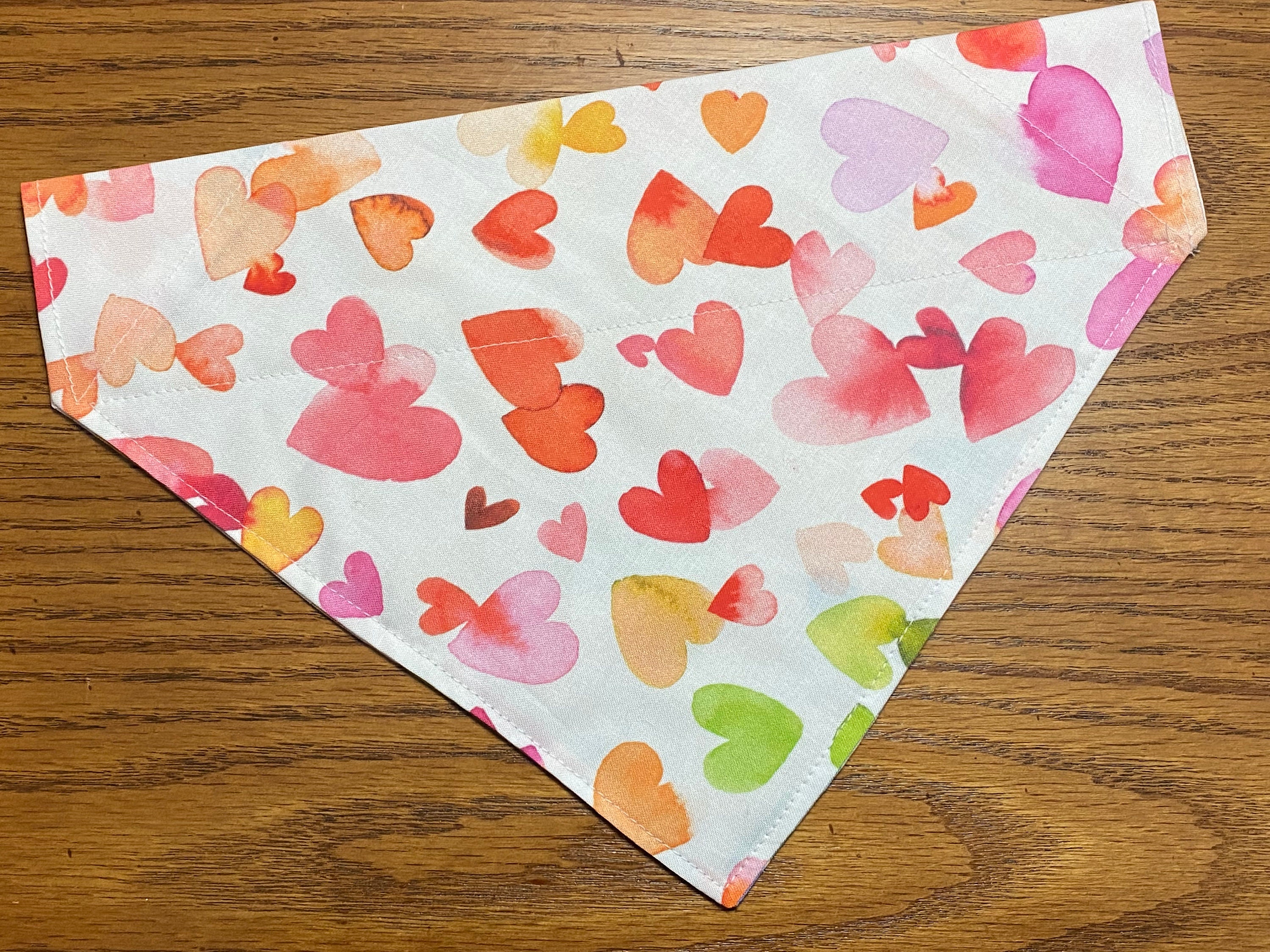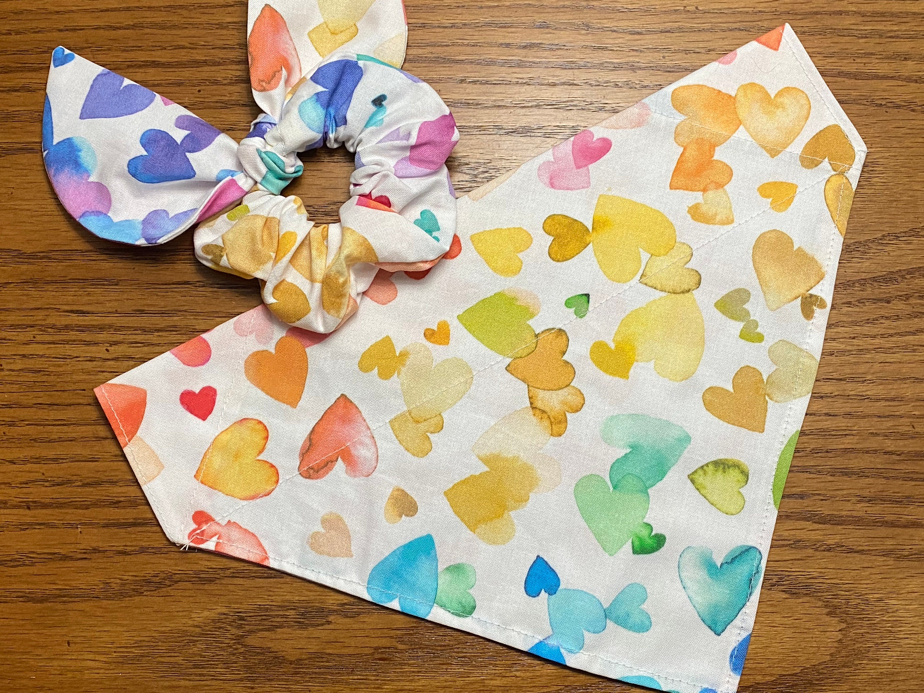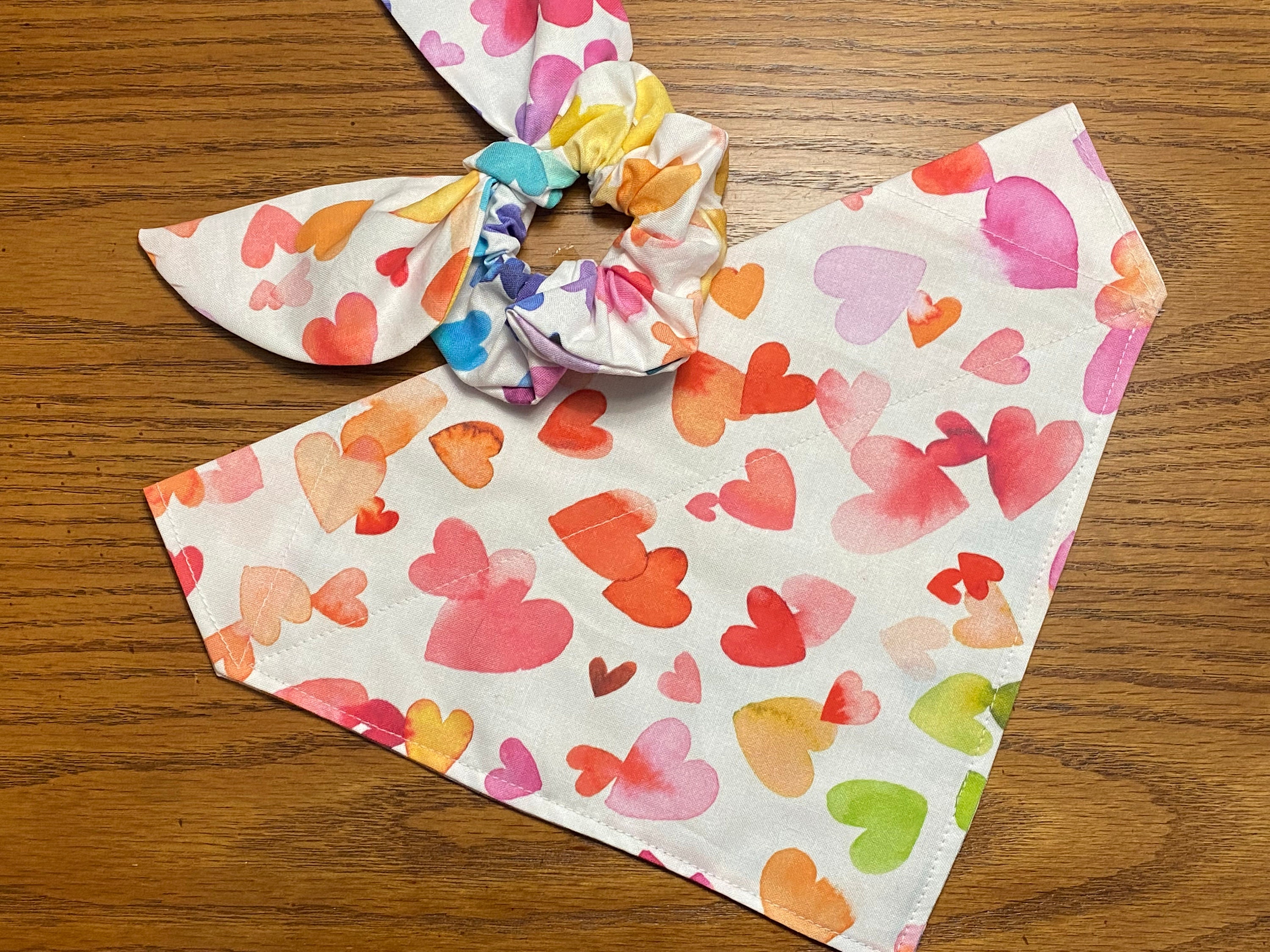 Pretty Watercolor Hearts Fabric. Each Bandana or Hair scrunchie will look a little different with the random colors of these watercolor hearts. Fun way to matching your pet.