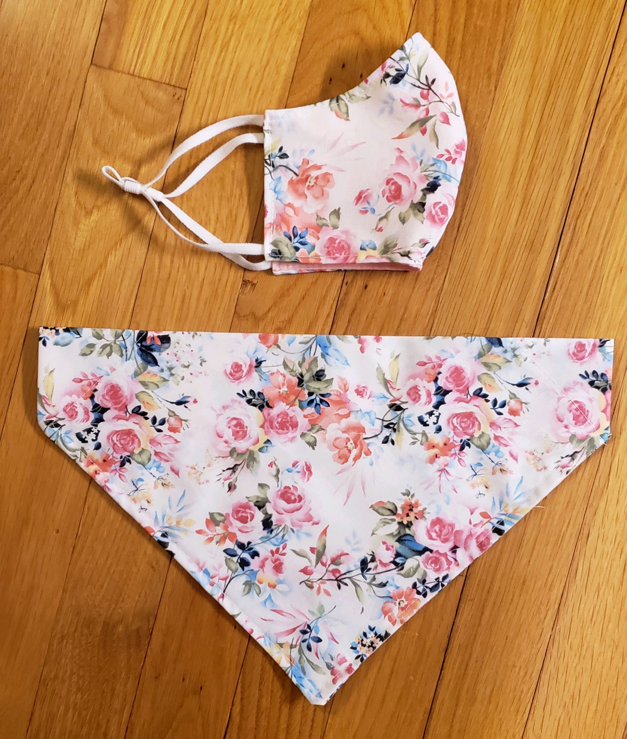 Pretty Roses on a creamy background make up this Great Pet bandana with matching hair scrunchie and face mask for human. :)