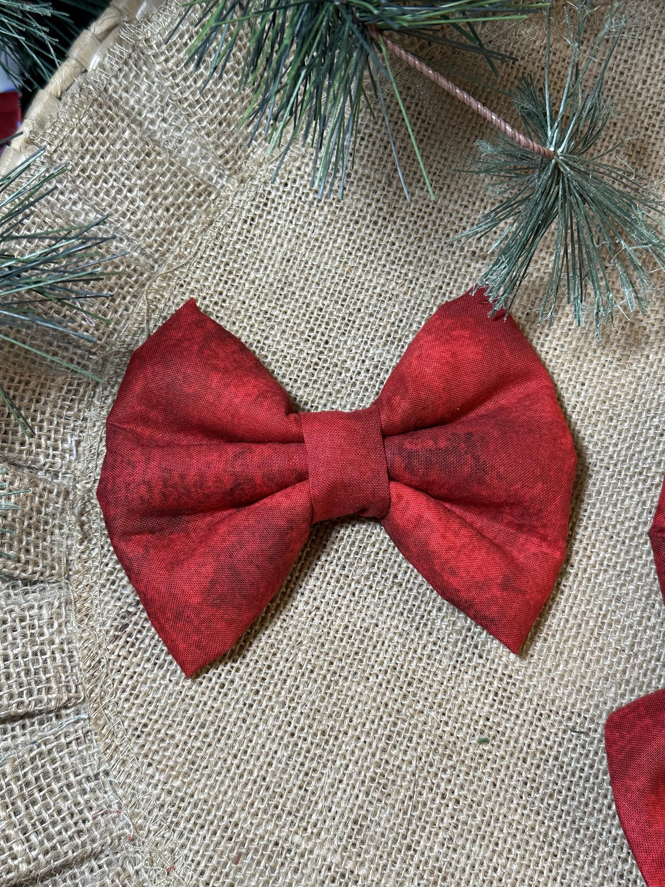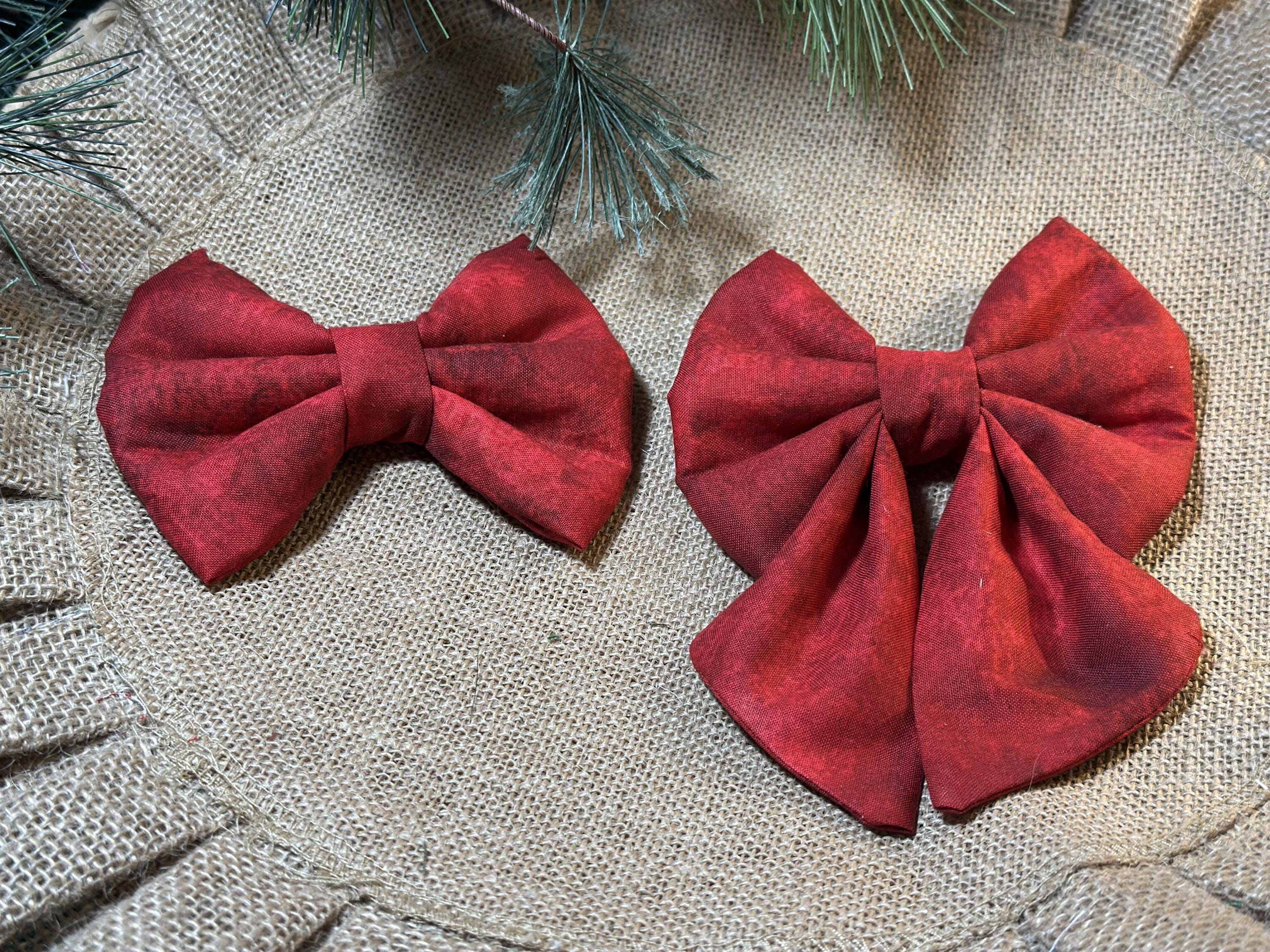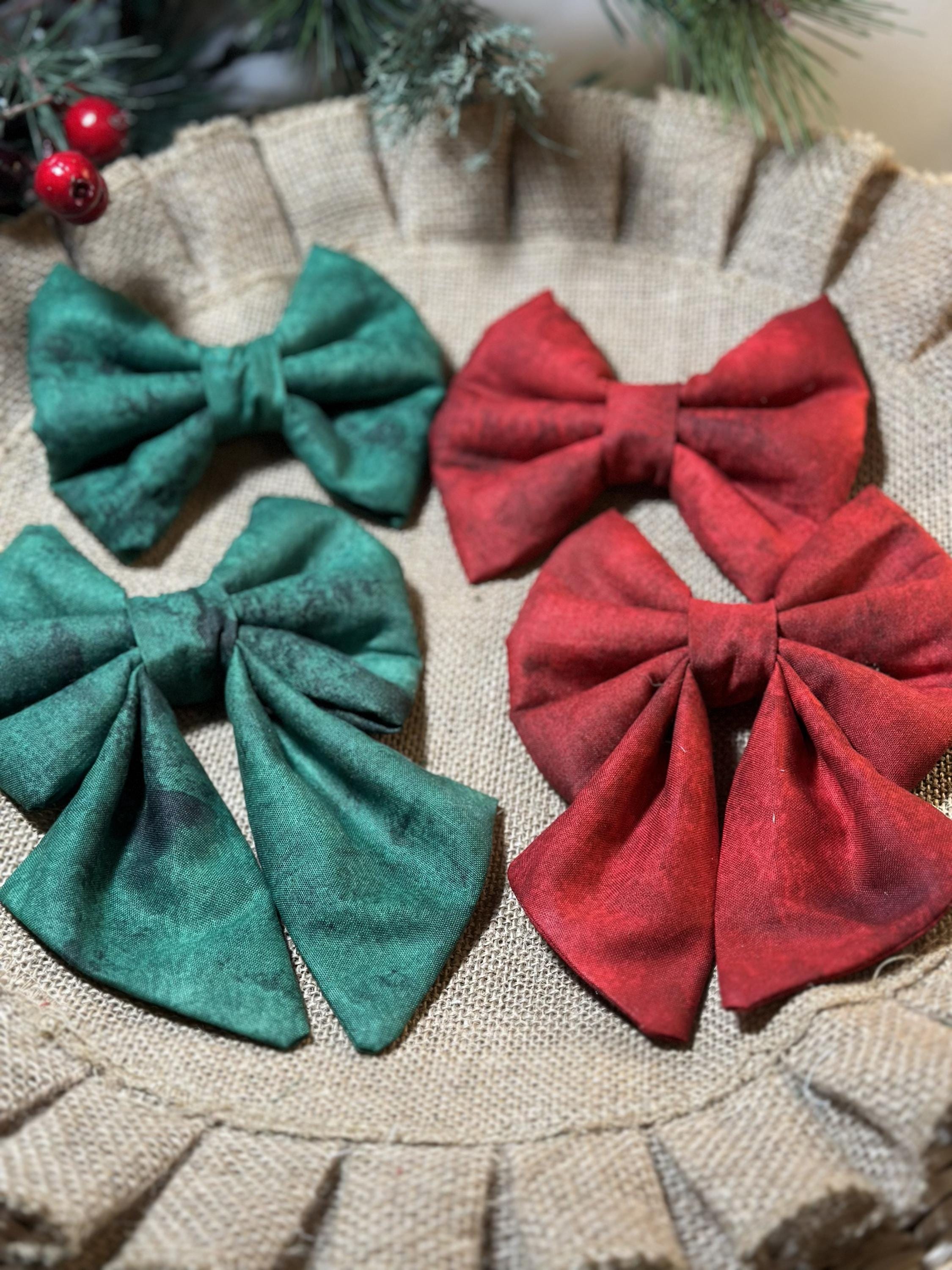 Super Cute Christmas Bows and Sailor Bows. Red and Green Traditional Christmas Bows. These Bows slide on your pups collar. Your pup will be ready for Santa wearing this bow. 2 Elastic loops on the back of the bow that you slide your dogs collar through. Loops should be snuggle to hold the bow upright.
