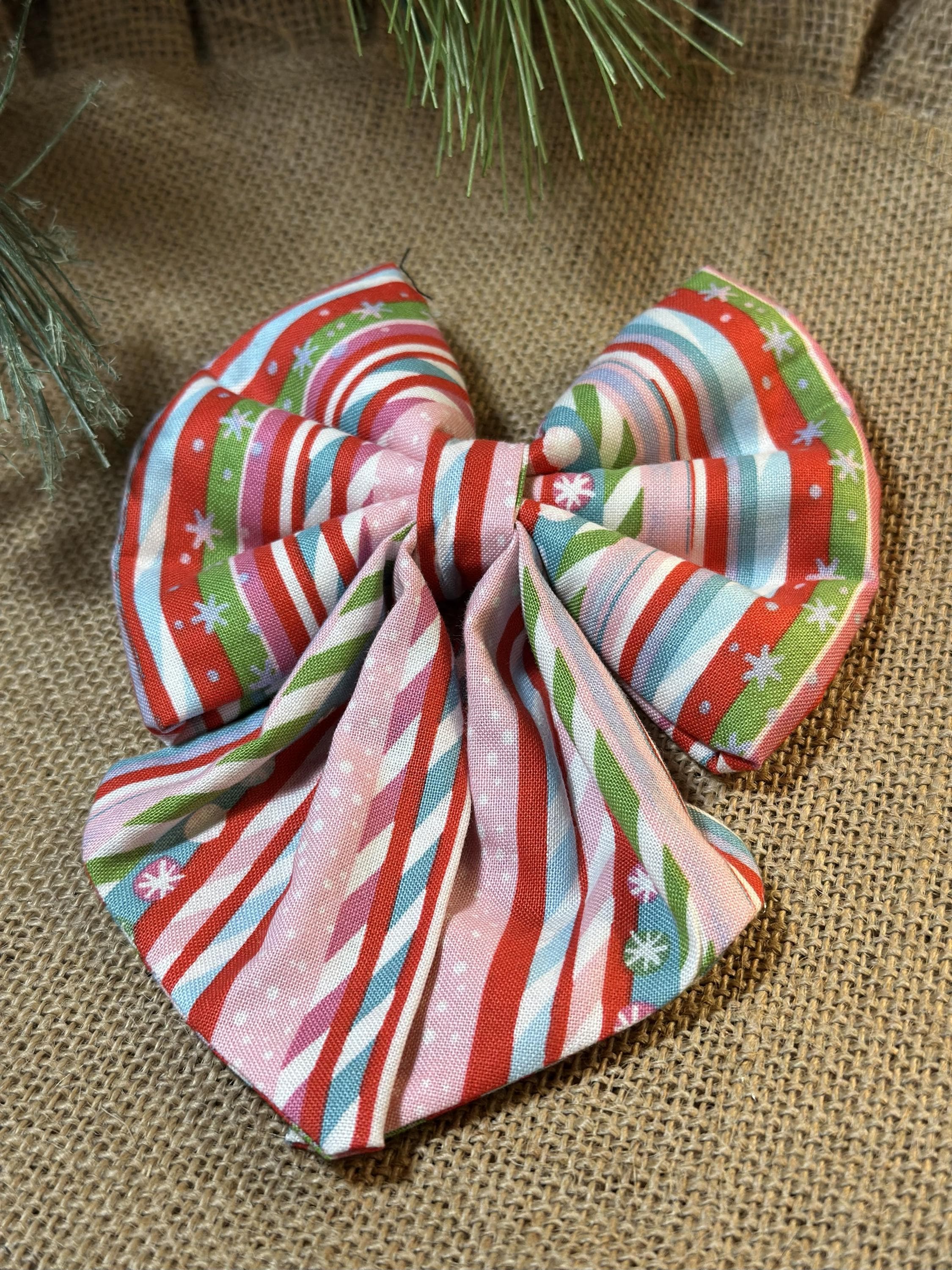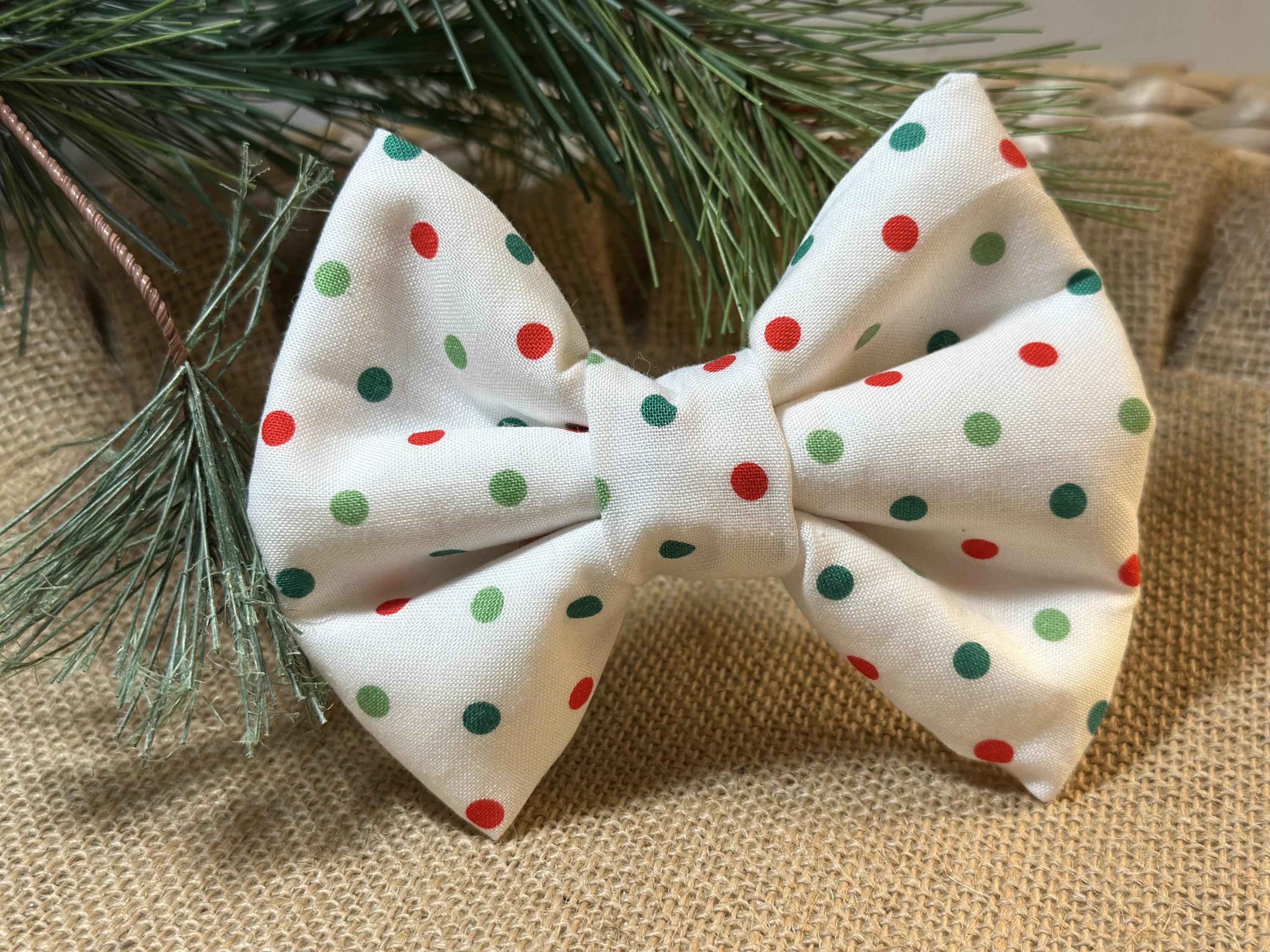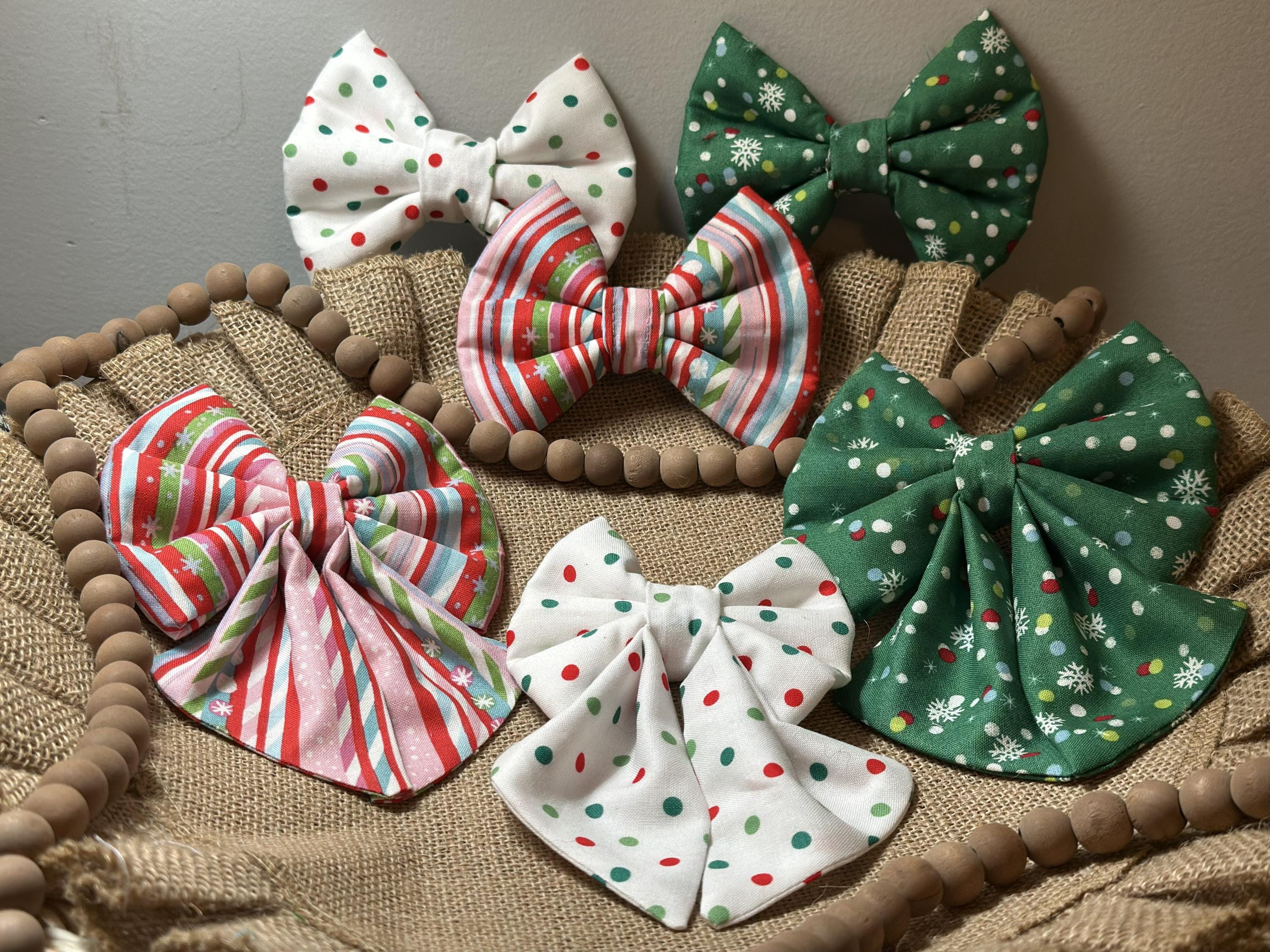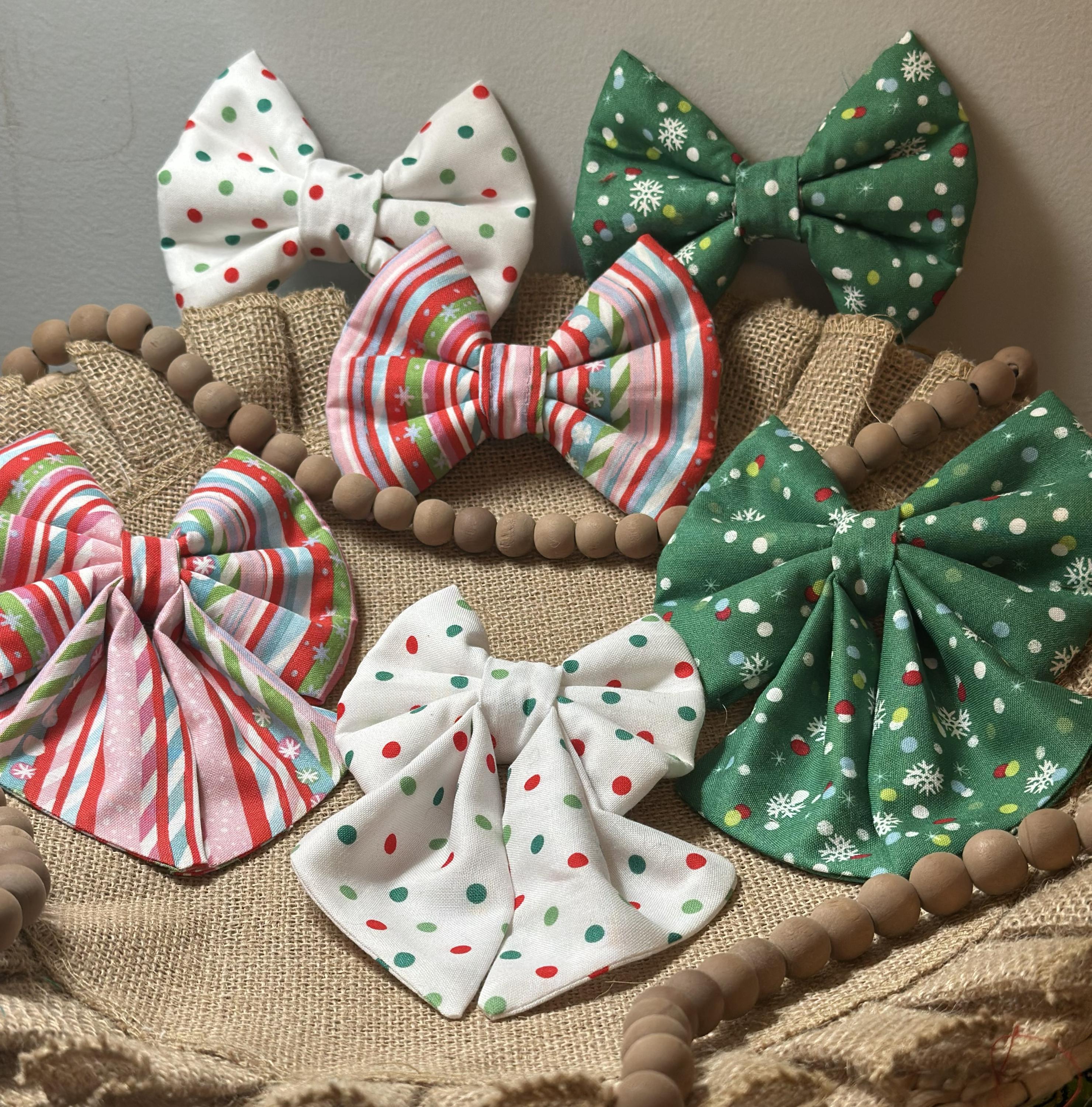 Super Cute Christmas Bow Ties and Sailor Bows... All of these Slide onto Your dogs collar. Your pup will be ready for Santa wearing this bow. Pretty Christmas Pink Stripe.. White with green and red polka dots.. and green with polka dots and snowflakes.. will dress up your pup perfectly this Christmas season.