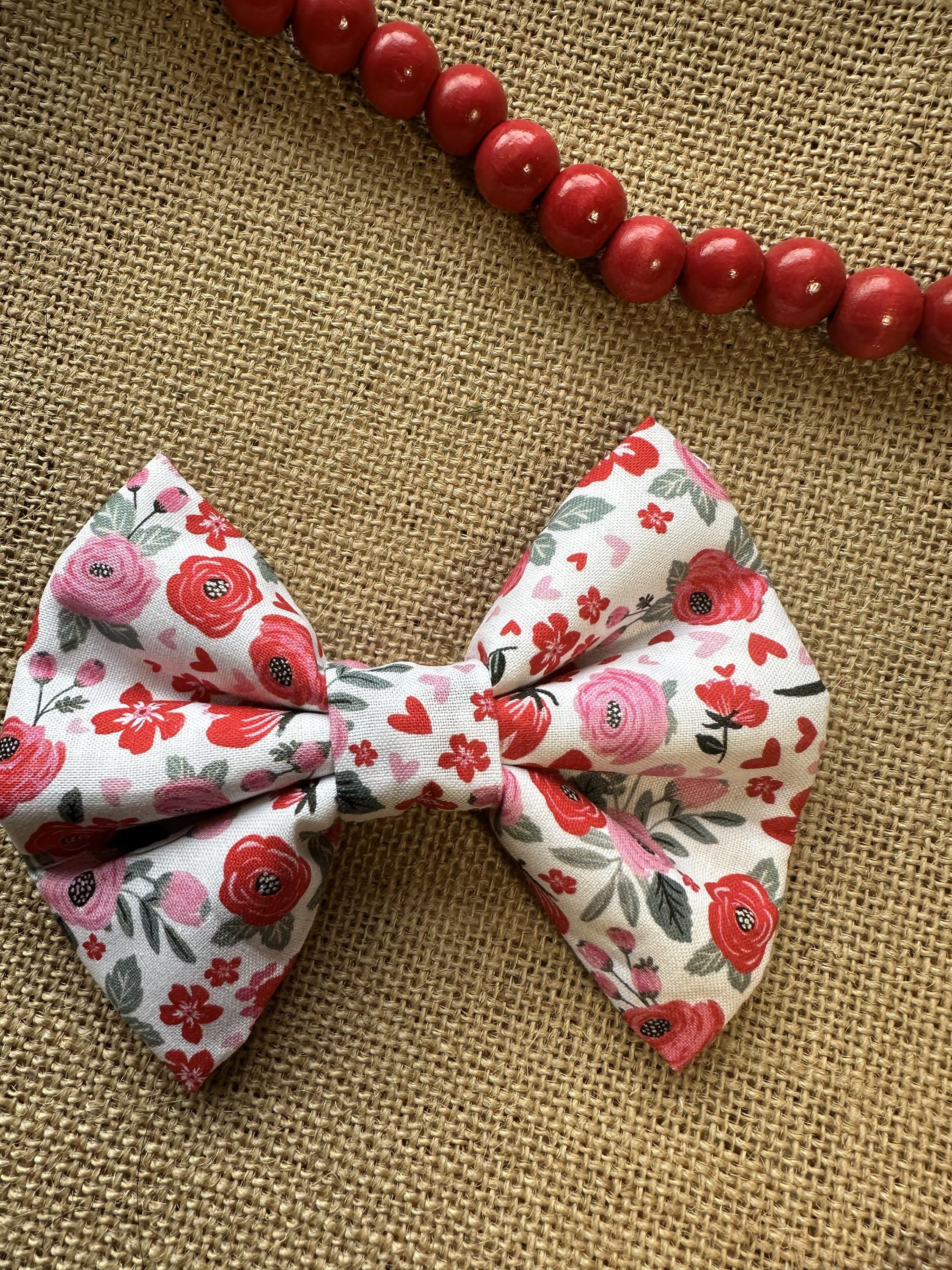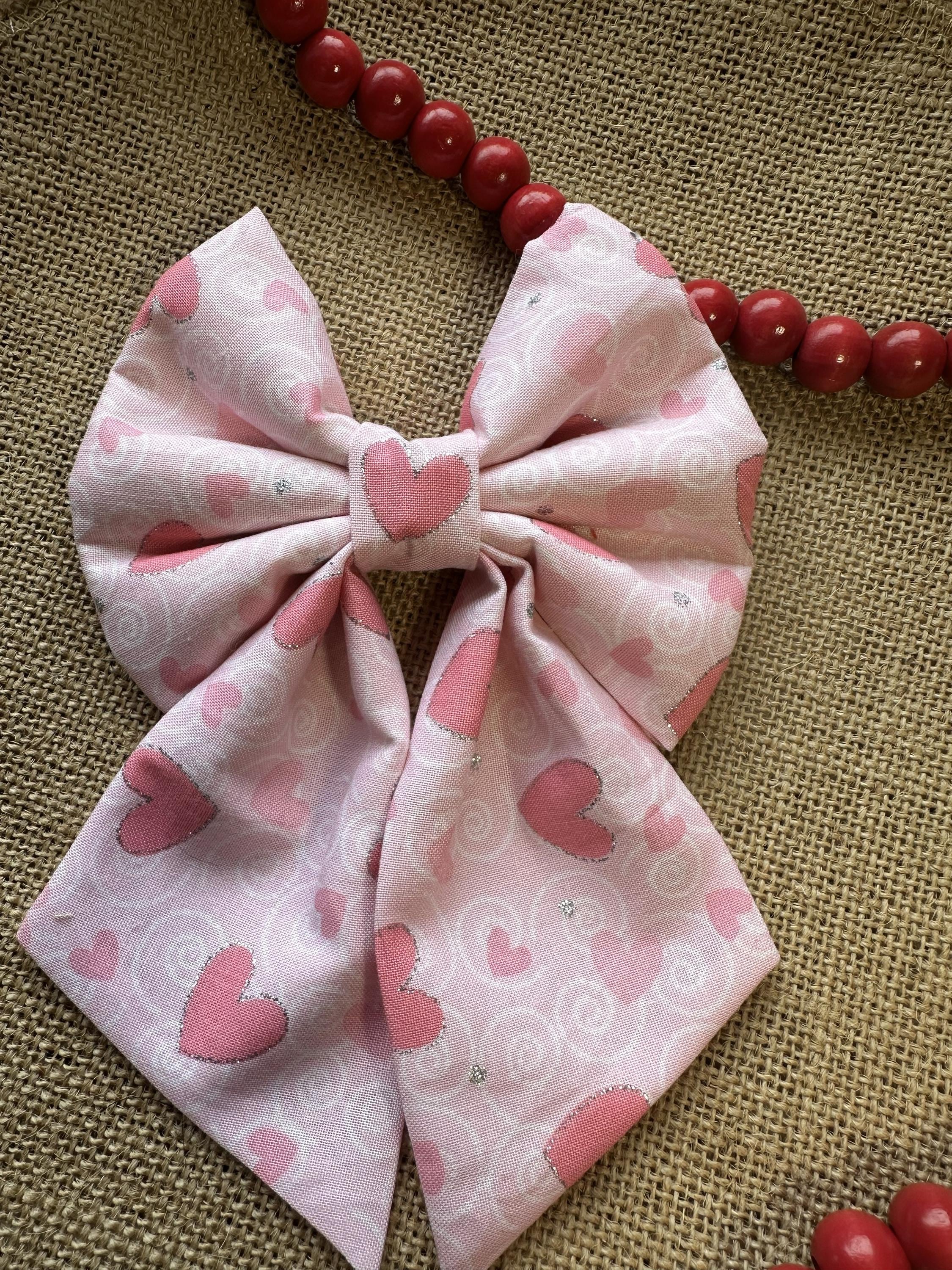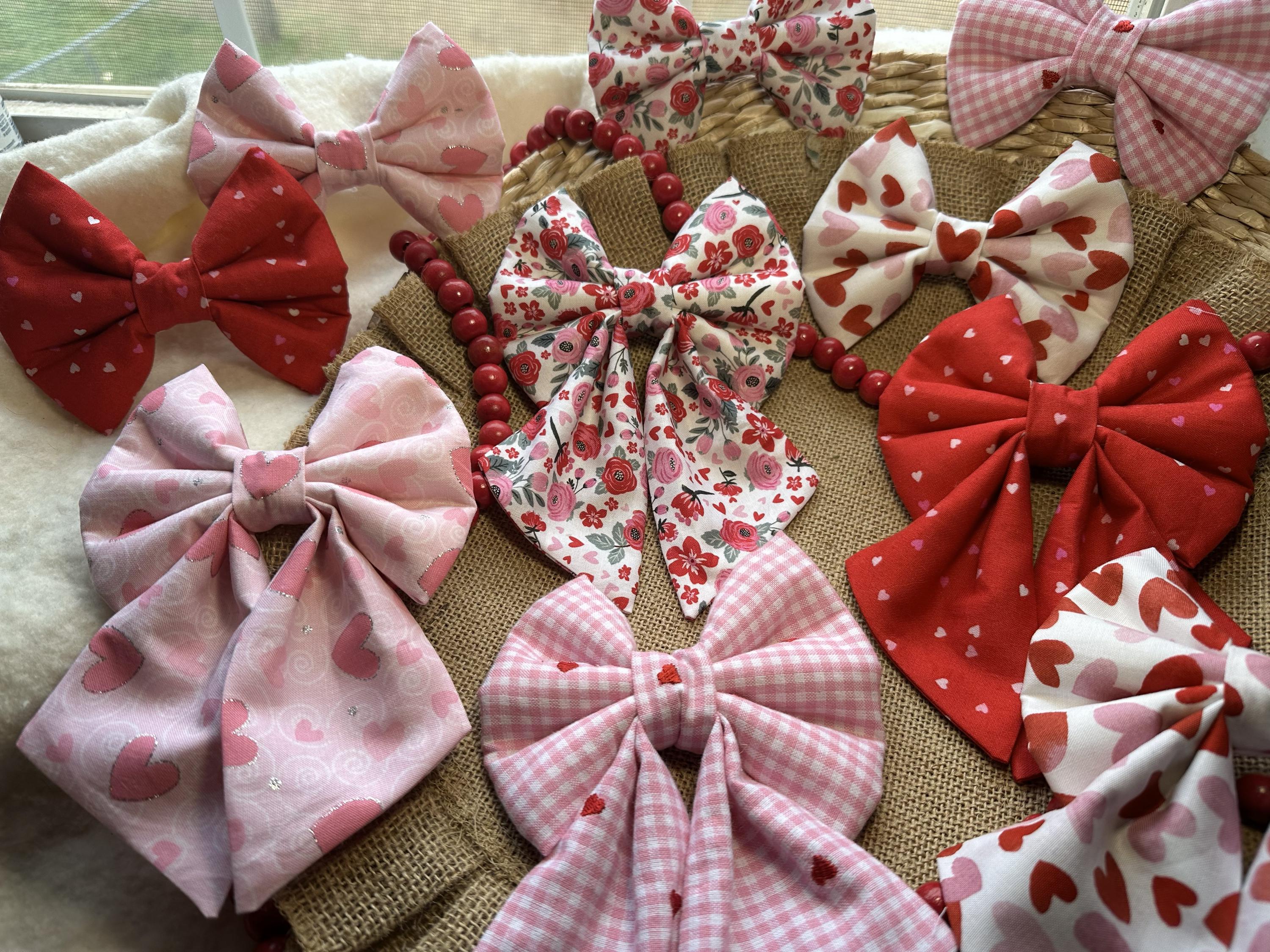 Super Cute Valentines Bows and Sailor Bows in several Valentine patterns. These Bows slide on your pups collar. Your pup will be ready for Love this Valentine's Day wearing this bow.