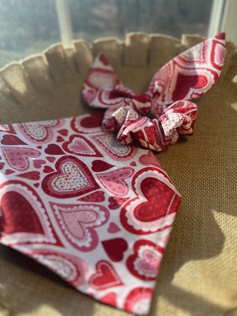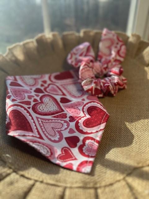 Pretty Hearts on this Valentine's Day Bandana for your Pet.... Matching Hair Scrunchie for owner available also.