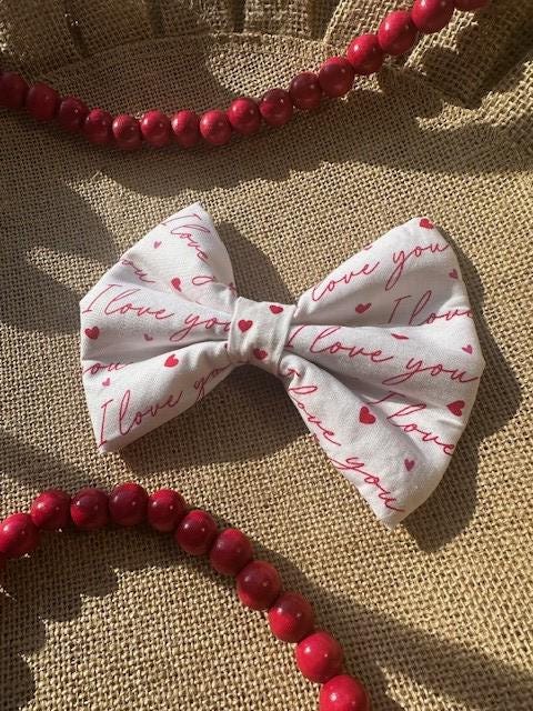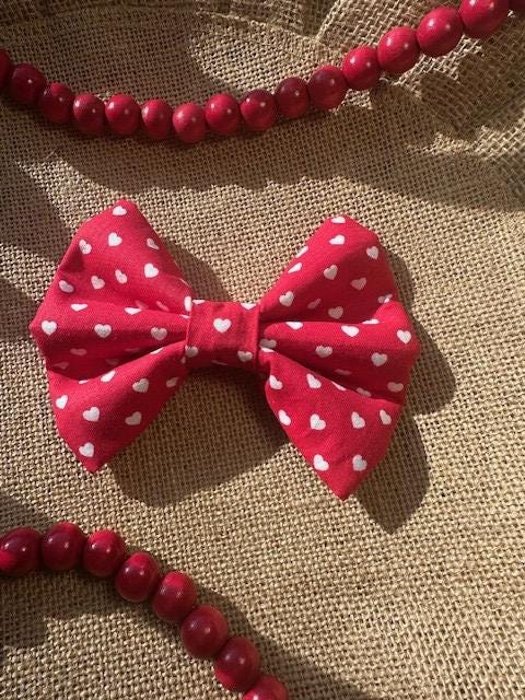 Super Cute Valentines Bows and Sailor Bows in several Valentine patterns. These Bows slide on your pups collar. Your pup will be ready for Love this Valentine's Day wearing this bow.